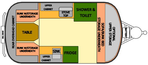 We considered the Backpack model because it had more windows and 6 inches more space. This was one of the simplest campers we considered with no black or grey tanks it has a port-a-potty and an outdoor shower only. There are several layout options including bunk beds and a triple bunk so you can pack a lot of people in this tiny trailer! They now make a version with an enclosed indoor wet bath, so far they have only made this with a king sized bed layout so it wouldn’t work for us but the company is very open to modifications based on customer needs and so it would be worth calling them to discuss layouts if you are interested. Because they make each one to order there are a lot of options and you can make special requests that they will try to include if possible. We especially appreciated the clever storage options including the under camper storage box.